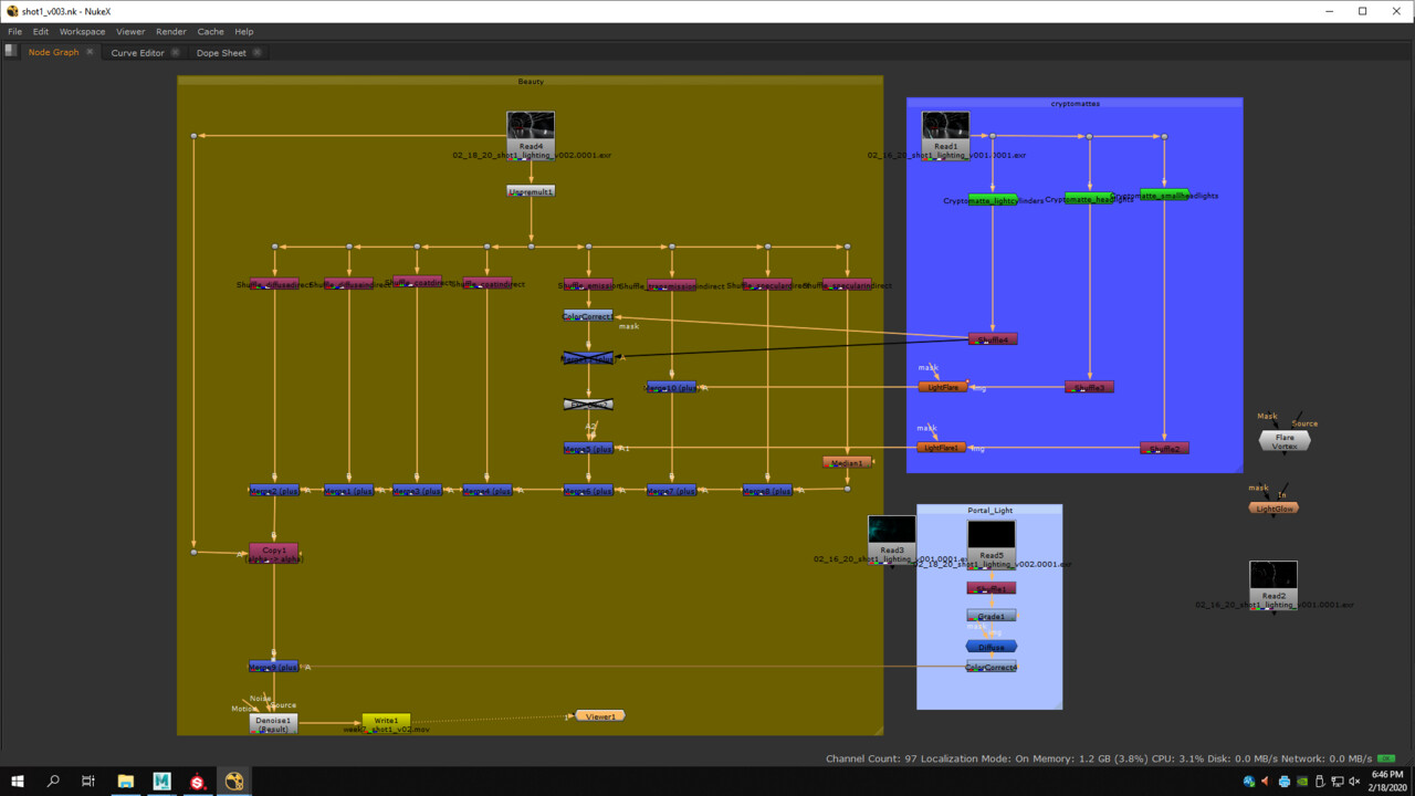I started the compositing for shot 1: separated some AOV's and put the portal light, as well as a first attempt to add lens flare and glow on the lights.
